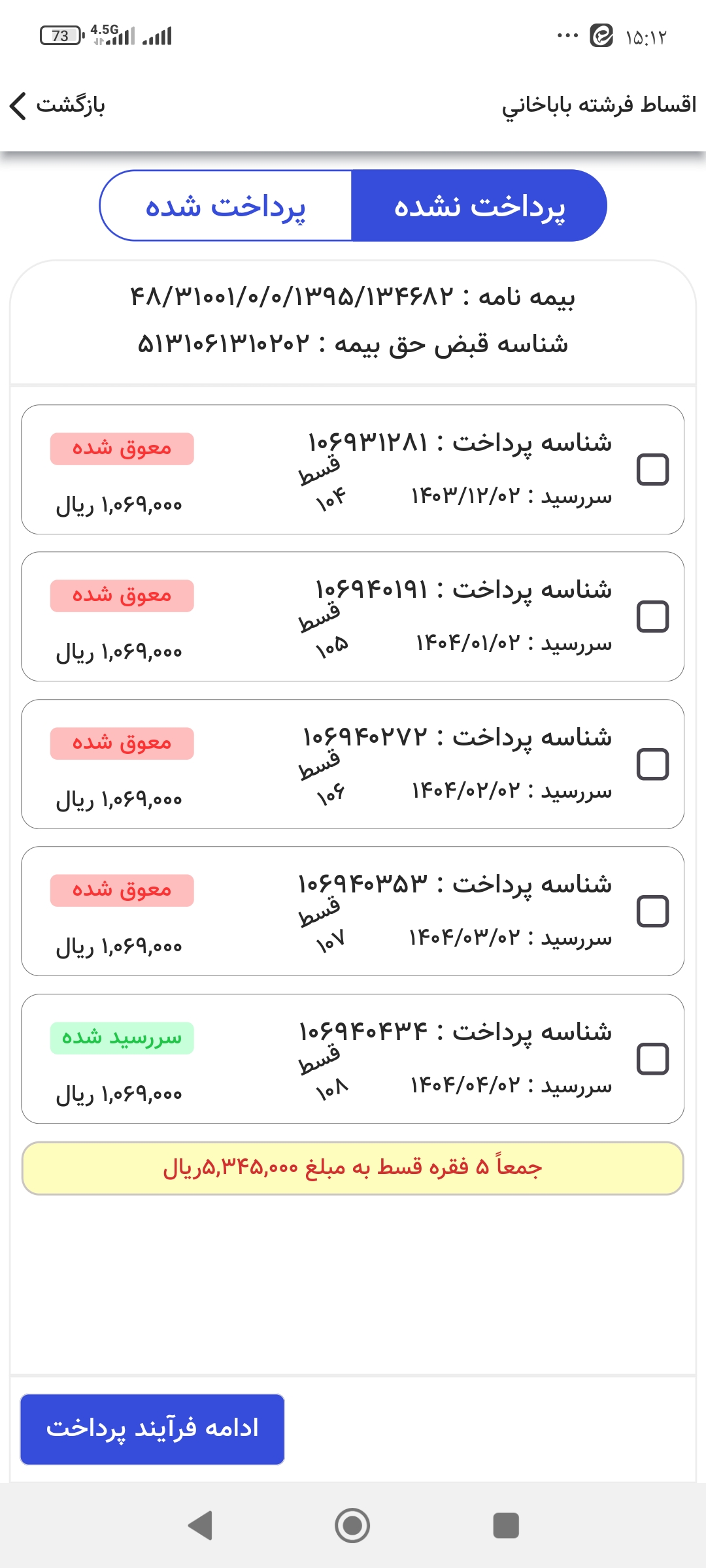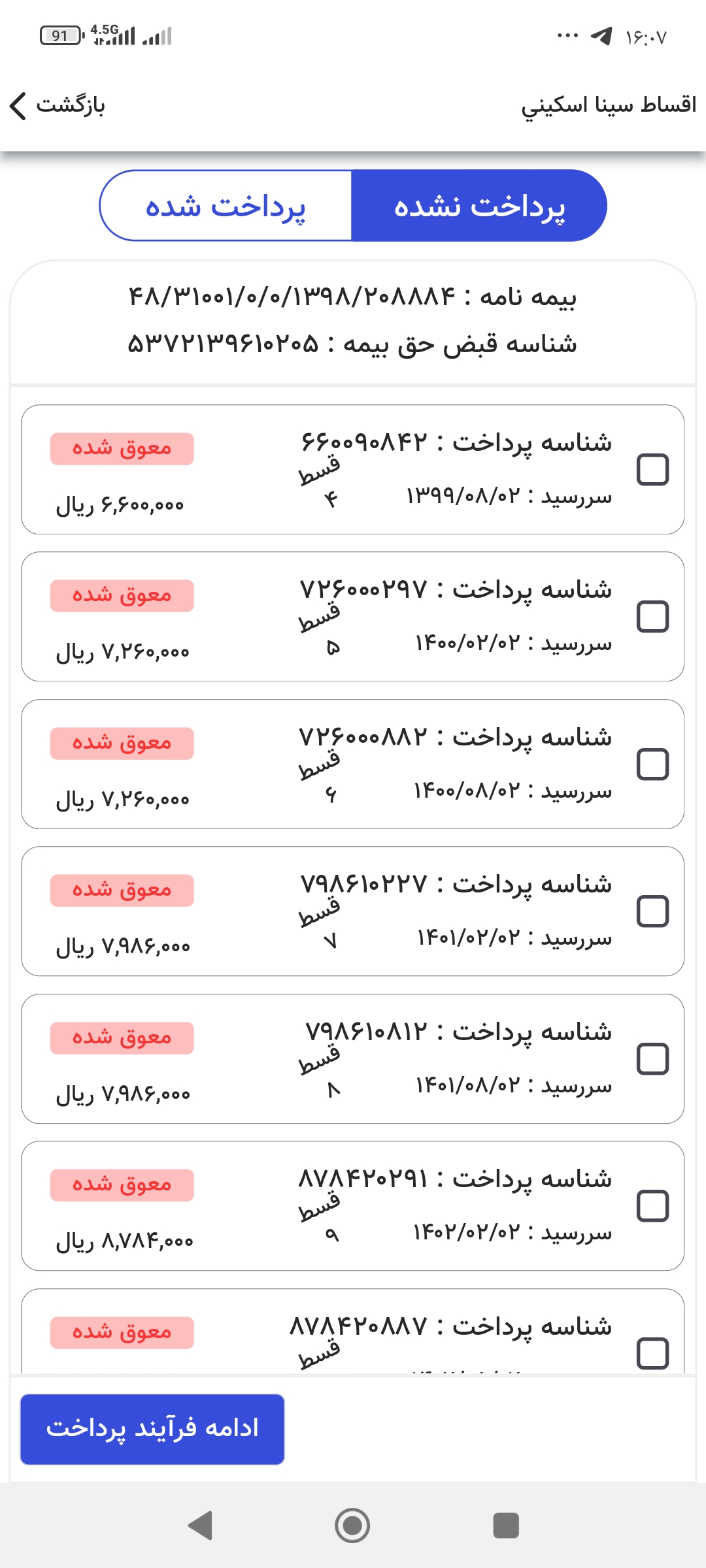 بعداز مشاوره با کد ملی بیمه شده ،شناسه قبض و پرداخت اولیه صادر و به بیمه گزاران ارسال میگردد، پرداخت هرگونه وجه به نماینده بیمه ممنوع و بیمه گذاران حق بیمه های خود را از طریق لینک پرداخت یا داشتن برگه اقساط خود و مراجعه به سایت ها و خودپرداز بانک پاسارگاد و صادرات پرداخت فرمایید